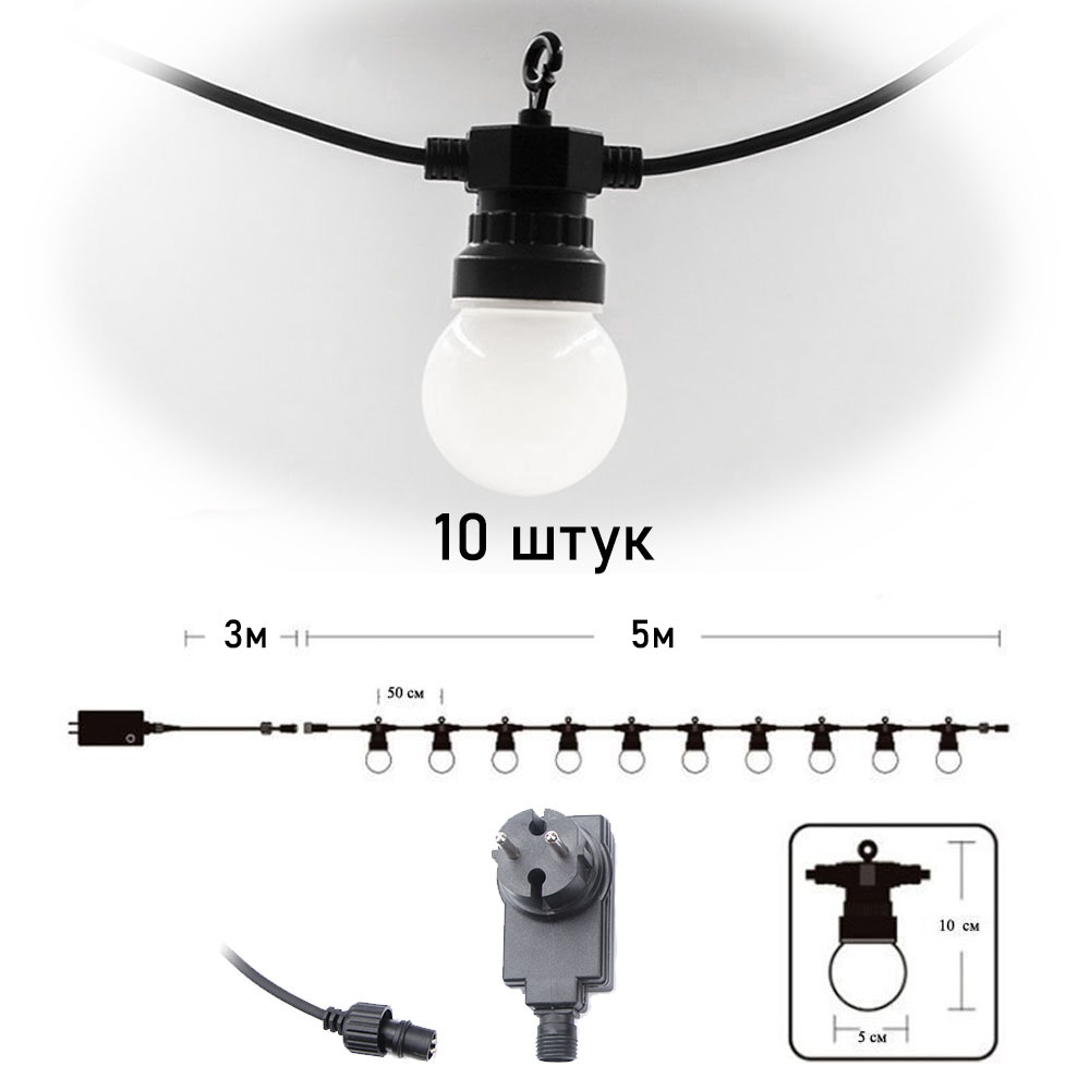 Гирлянда Патио из диодных ламп от сети 5м 5см х 10шт, белые