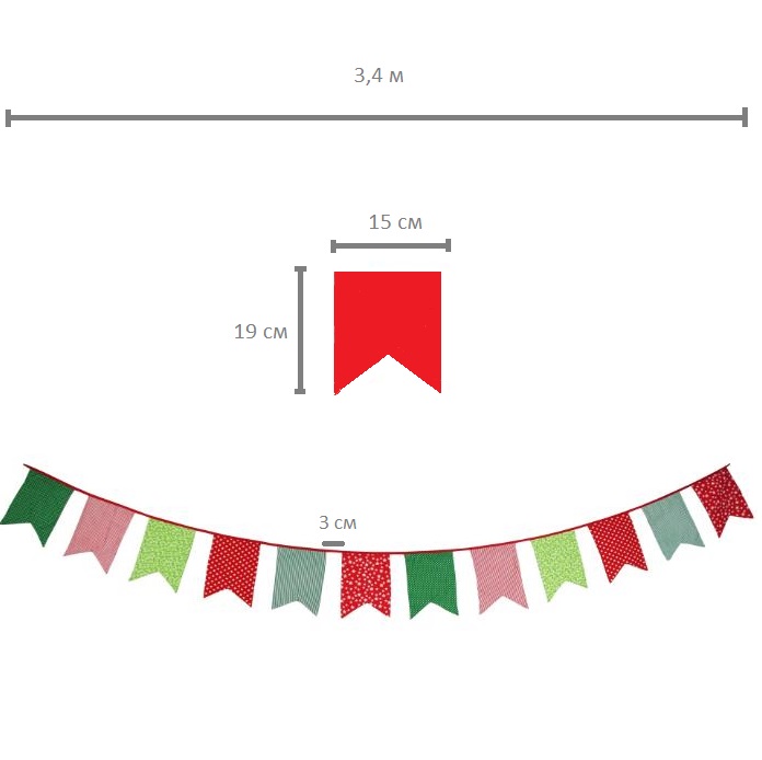Гирлянда состоит из 12 флажков, общая длина составляет 3,4 м, расстояние между флажками 3 см, длина матерчатых флажков 2,1 м, длина лямок с обеих сторон по 50 см