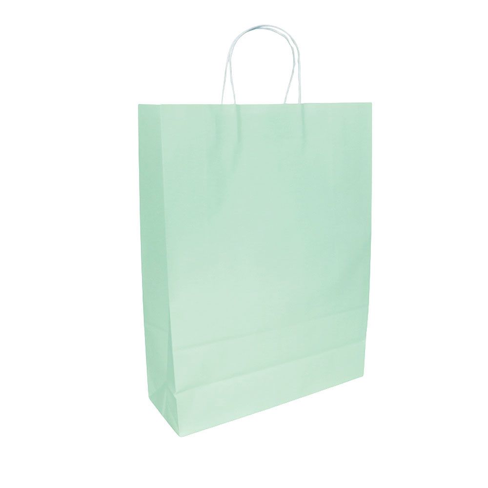 Подарочный пакет из крафтовой бумаги пастельного оттенка с белыми бумажными ручками и белой внутренней стороной.