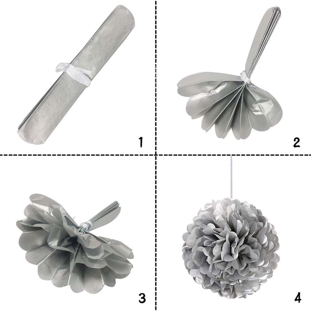 Серебряный бумажный помпон диаметром 40 см — стильное и лёгкое украшение для праздников, фотозон, витрин и интерьера. Отлично подойдёт для дней рождений, свадеб, вечеринок и тематических мероприятий.